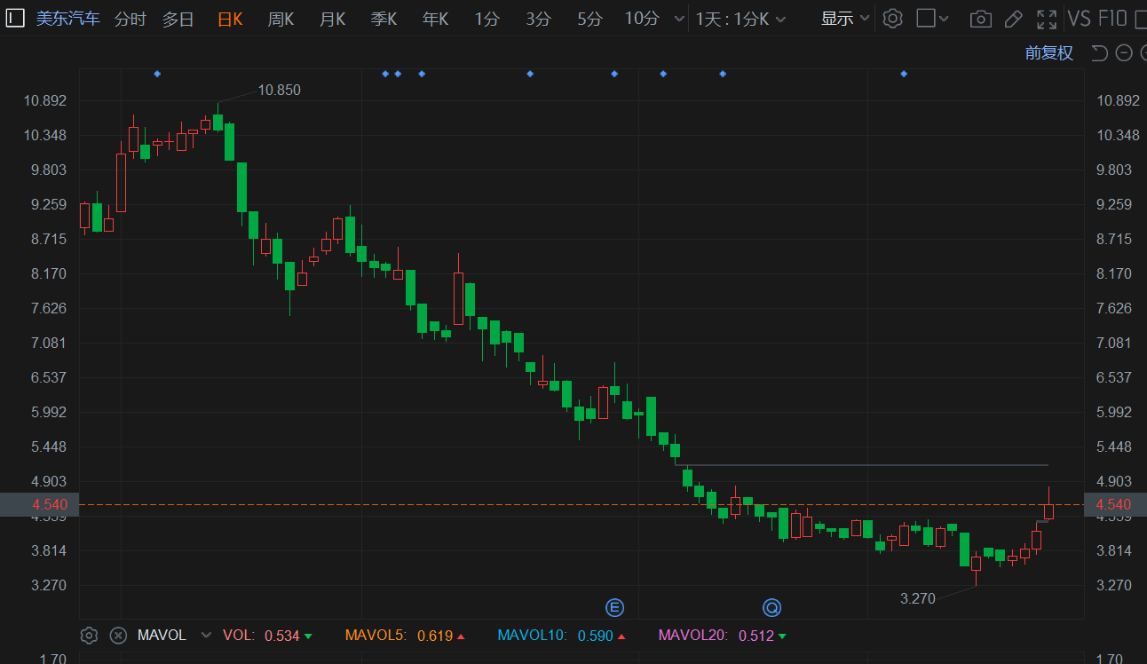 美东汽车(1268.HK)延续反弹行情,盘中一度大涨17%,4日连涨25%,现报4.54港元,总市值61亿港元。消息上,昨日南向资金增持24.2万股美东汽车,截至目前,南向资金持有公司7828.5万股。另外,近期获董事会主席叶帆连续增持,在本月16、18日分别增持100万股和20.4万股。 现在送您60元福利红包,直接提现不套路~~~快来参与活动吧! 海量资讯、精准解读,尽在新浪财经APP